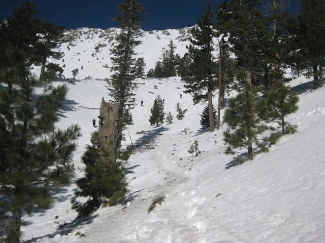 This incident factored into my plans to hike no further than the area of the Baldy Bowl and not attempt to ascend to the summit. Because of the massive crowds that want to play in the snow at lower elevations I had to get to the Manker Flat area well before 7 AM to secure a good parking spot.